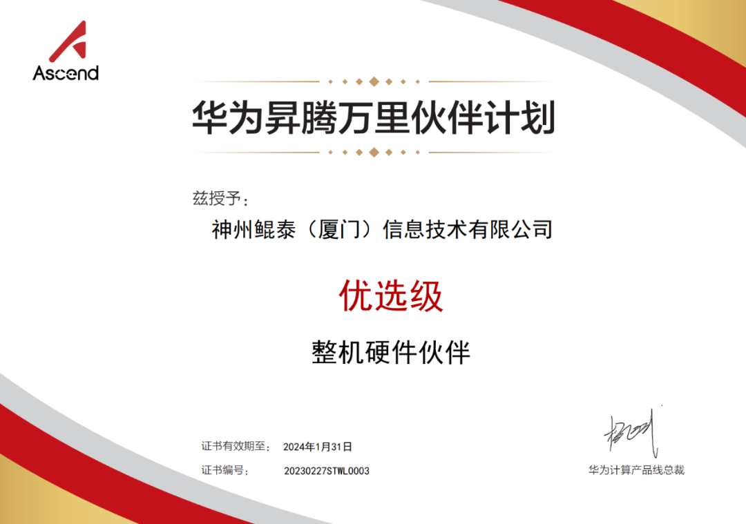 近日,710公海官网数码旗下神州继获得华为鲲鹏领先级整机硬件伙伴认证之后,再获华为昇腾优选级整机硬件伙伴认证!这是神州与华为昇腾深化合作的硕果,也代表着710公海官网数码信创业务在AI领域获得生态伙伴的充分认可。